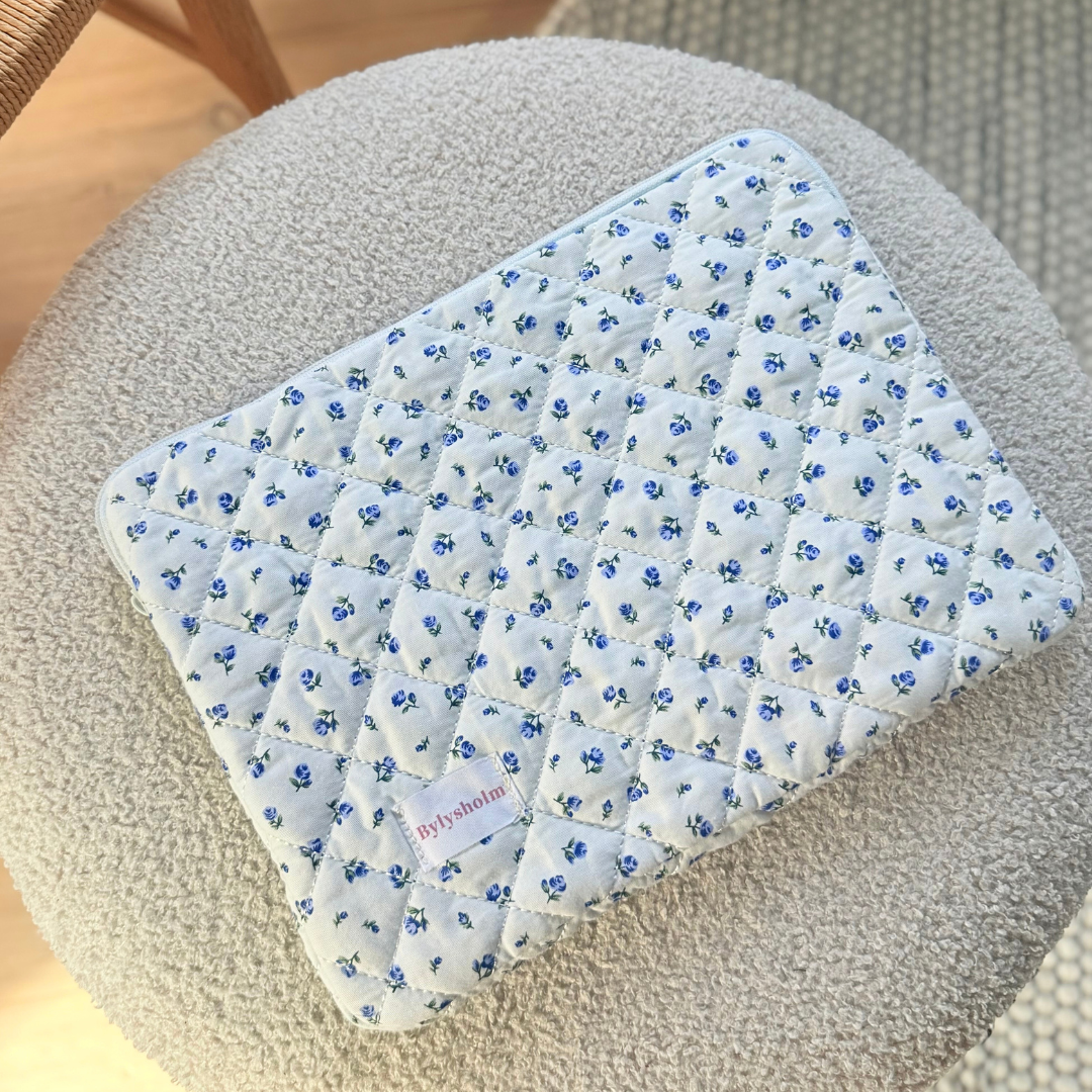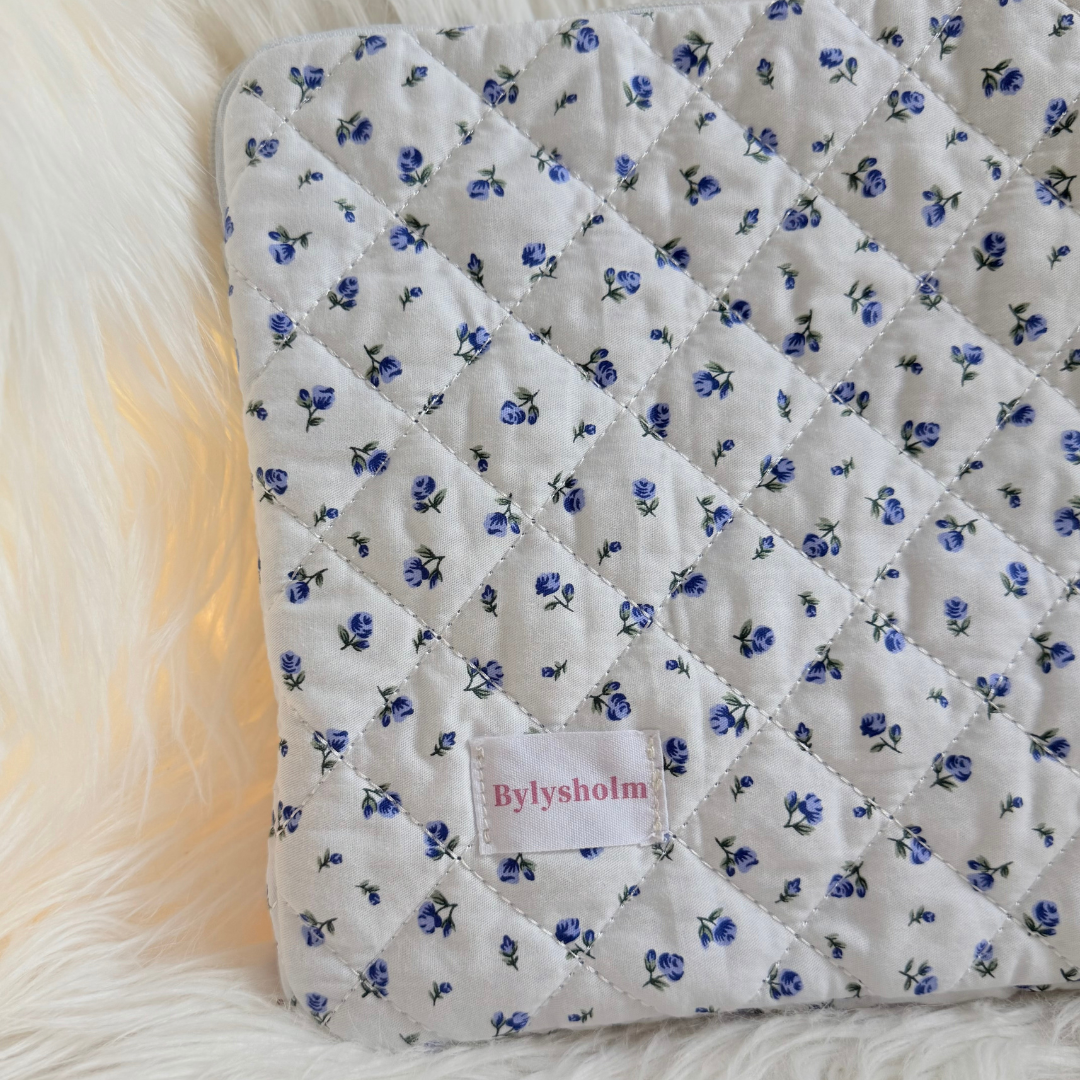 Irish computer sleeve 13" er et blødt og quiltet sleeve i lyseblå med små blå blomster. Det beskytter din computer mod ridser og stød, mens det feminine mønster og den fine ByLysholm-label giver et personligt og elegant udtryk. Passer perfekt til en 13-tommer bærbar computer.