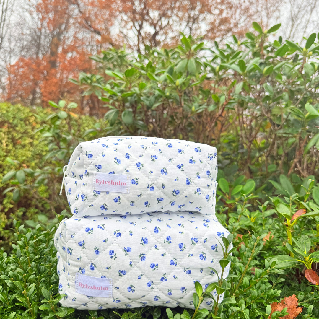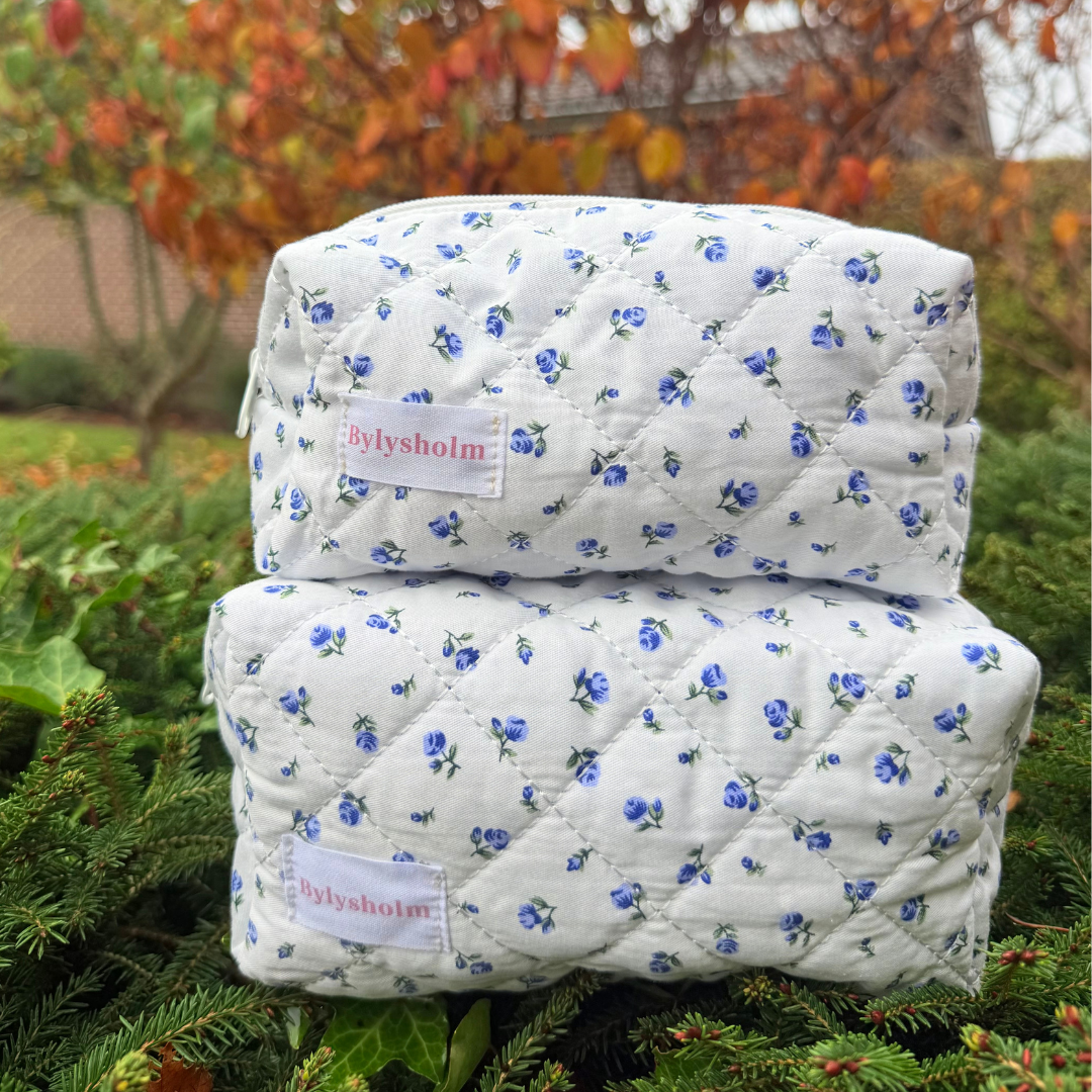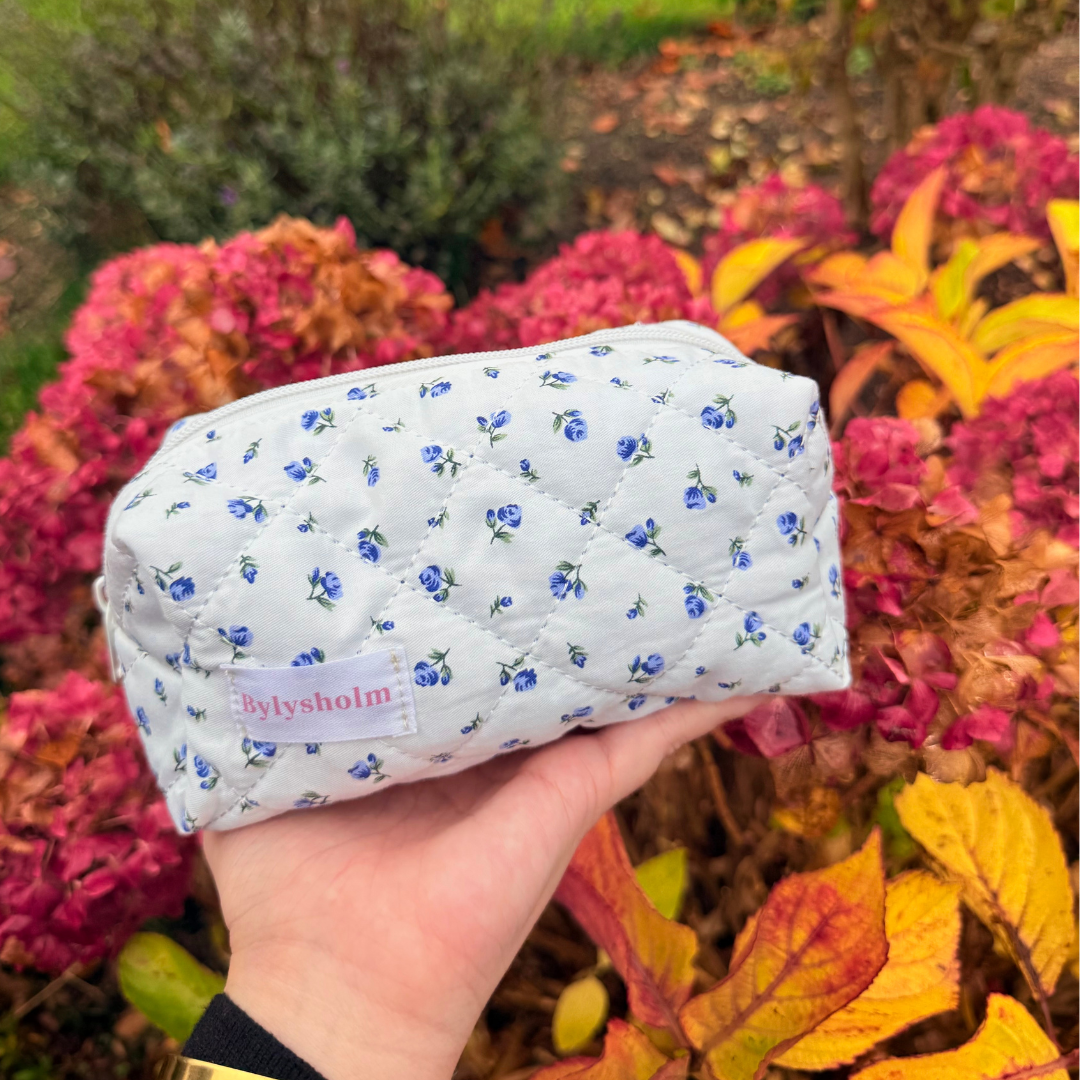 Irish er den perfekte makeuptaske til dig, der elsker romantiske detaljer og et feminint udtryk. Den bløde, quiltede overflade er pyntet med et smukt blomsterprint i blå.