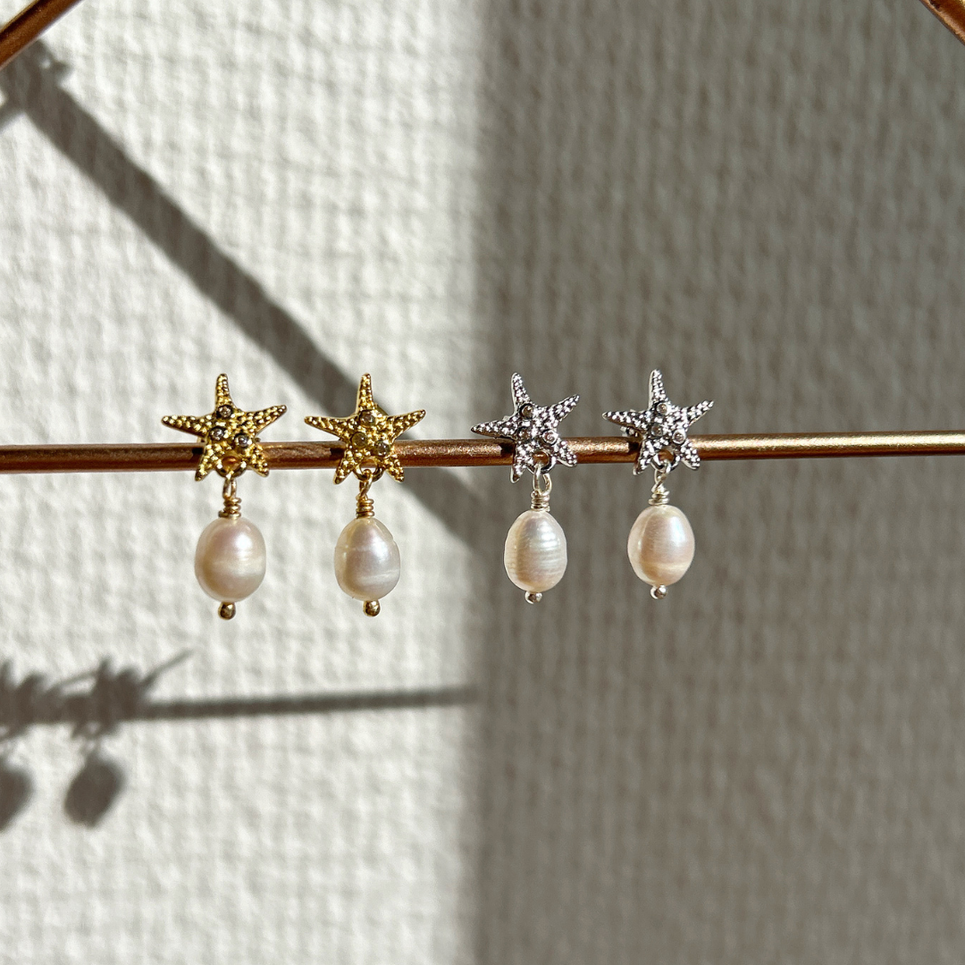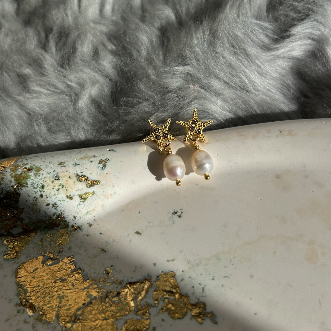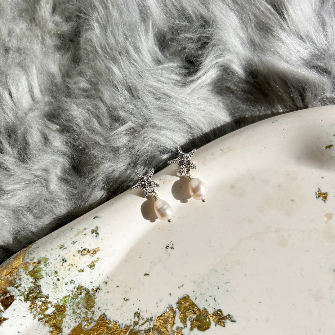 De smukkeste palma øreringe, med de fineste søstjerne ørestikker med zirkonia sten i champagnefarve. Ørestikkerne design af 100% af Bylysholm, sammensat med ægte ferskvandsperler.