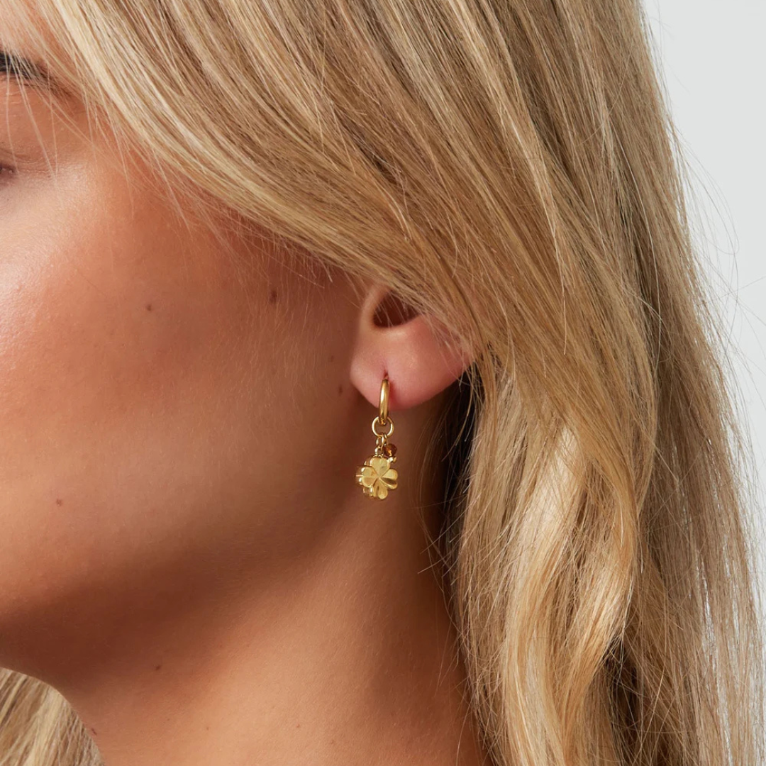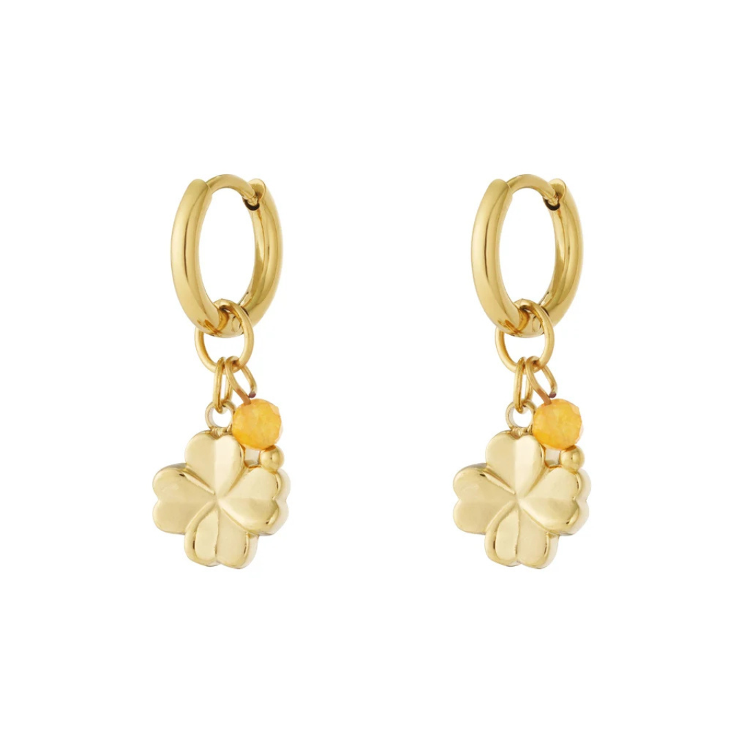 Vores smukke Elegante stellabella øreringe med et detaljeret kløver vedhæng og en orange sten. Perfekt til både hverdag og fest.